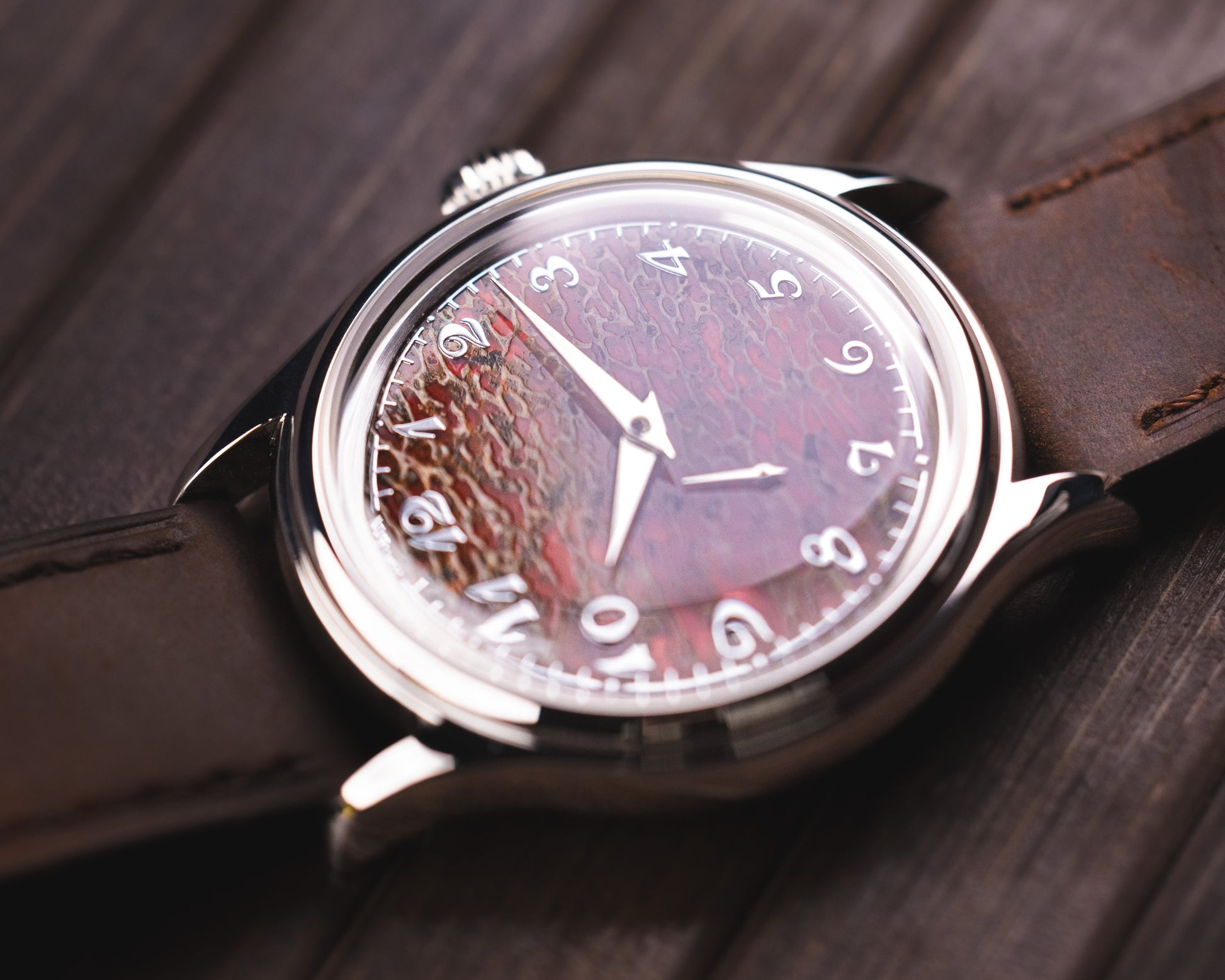 The watch now features applied Breguet numerals, adding depth and classical elegance, paired with a finely executed applied minute track that frames the fossil surface with precision. The contrast between ancient material and refined watchmaking details creates something that feels both raw and sophisticated at the same time.