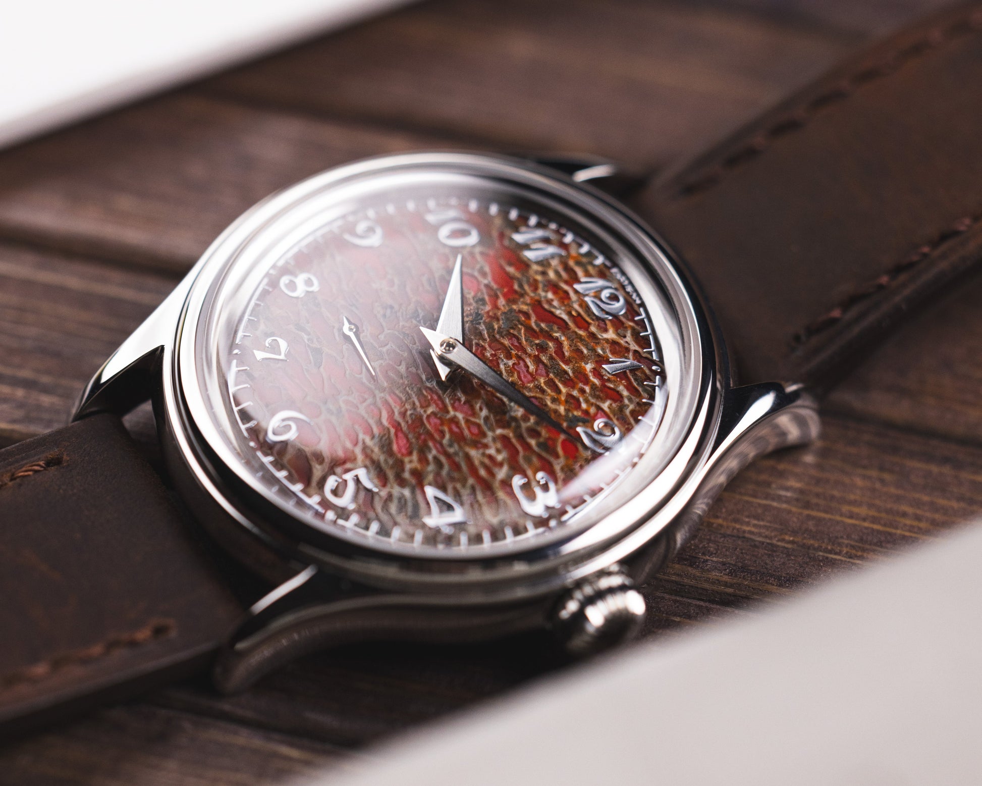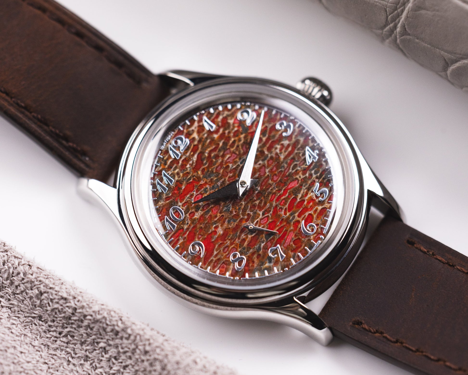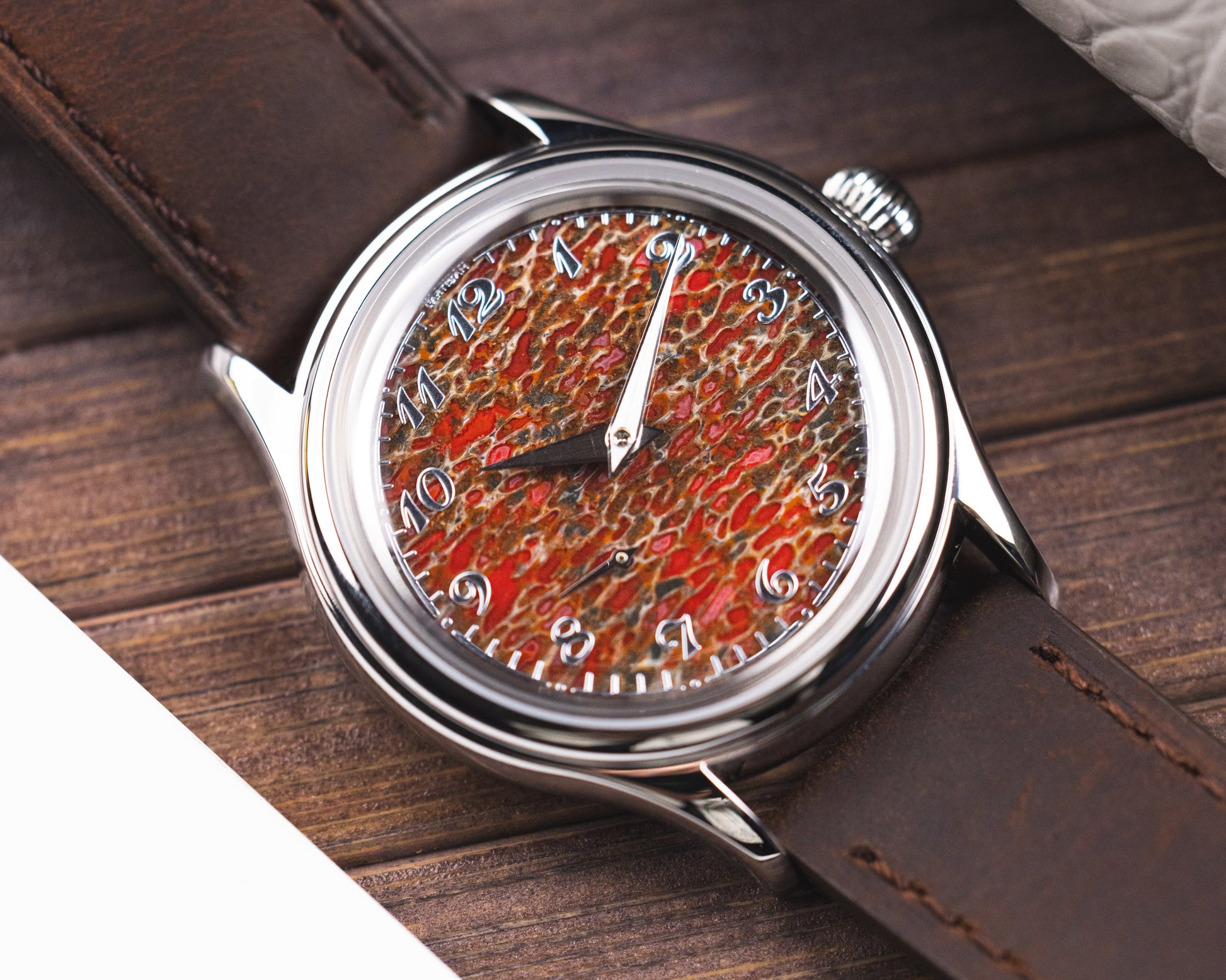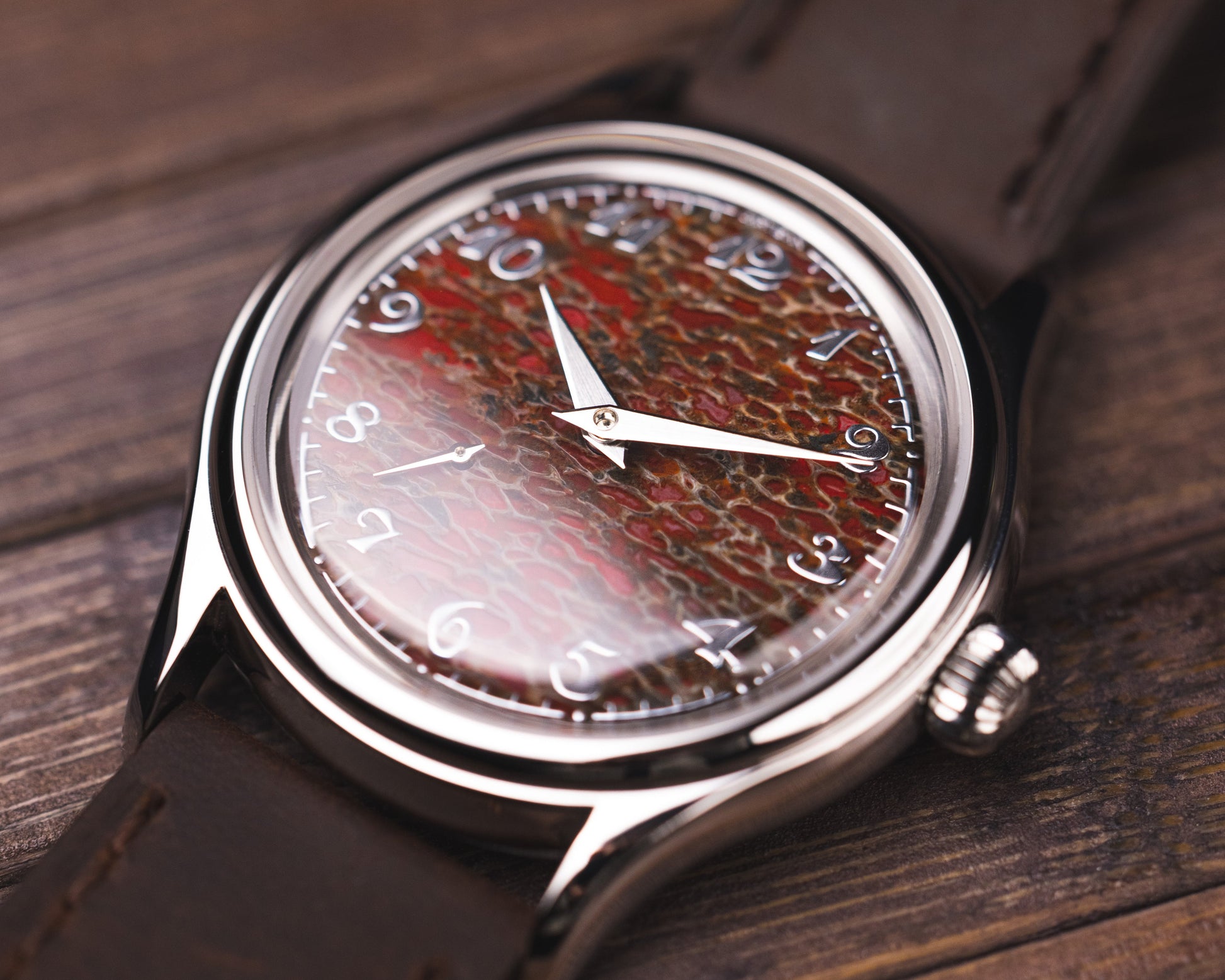 The dial you see was once part of a living creature that walked the Earth long before us. Over time, the organic material fossilised into stone, creating a rich, textured surface with deep, natural patterns that can never be replicated. Each dial is entirely unique shaped by nature, preserved through time, and now given a new life on the wrist.