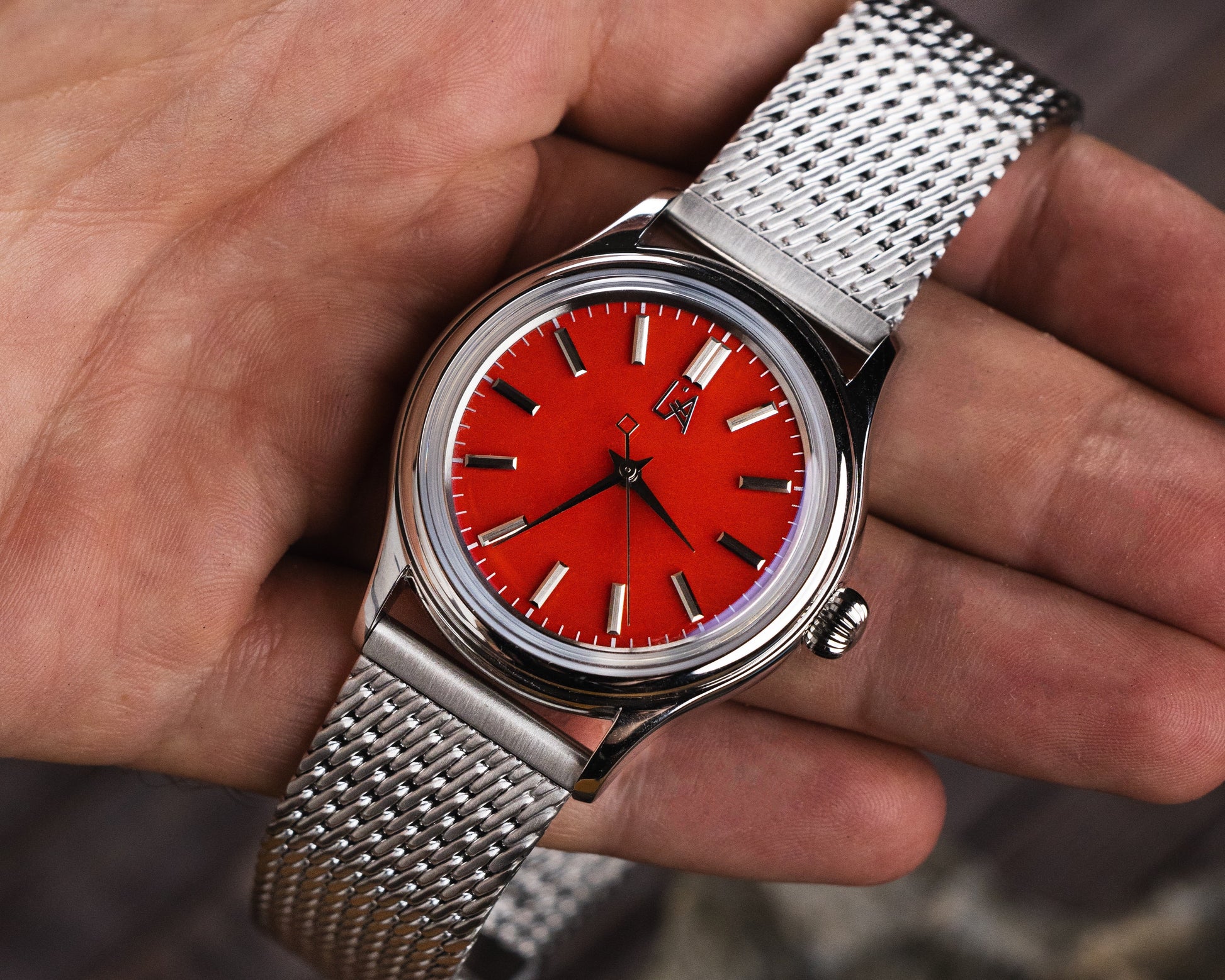 What a great little watch this is. Dial is the star and well complimented by faceted polished and brushed dial furnishings. Nice size. Mesh is thick and lovely. Clasp a little big and off center on my wrist but seats well enough on my wrist. Bravo team it’s a winner.