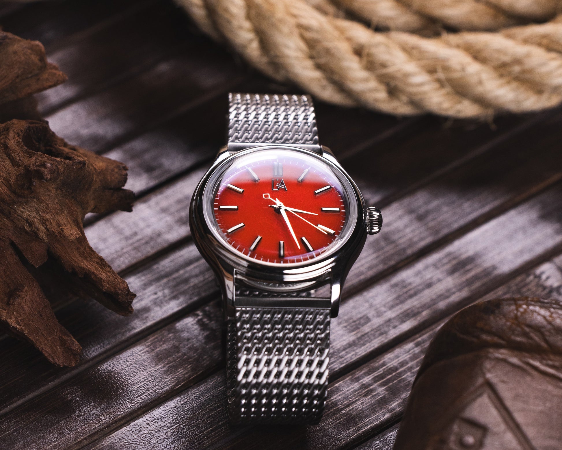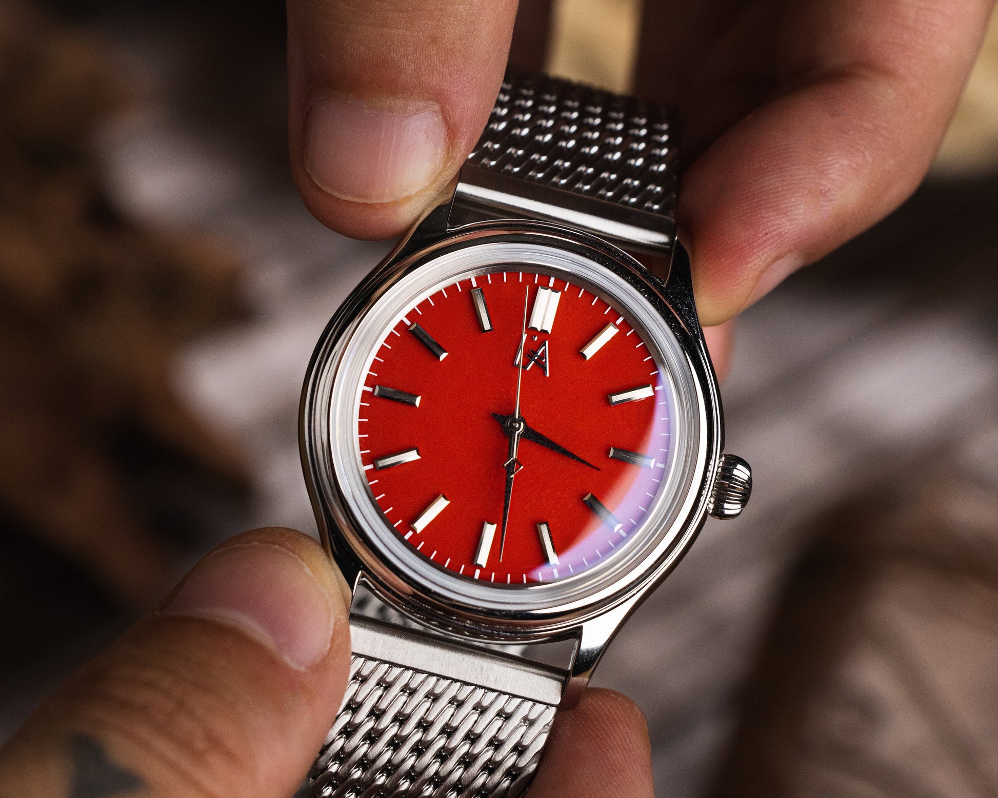 Wow, this watch is stunning! The red agate dial is absolutely gorgeous with this amazing glow and all these rich, warm tones that just pop. The way it catches the light is incredible, showing off these deep red and orange hues. The case looks really classy, and the mesh strap feels great, sturdy but comfortable, giving the whole thing a really nice, polished vibe.